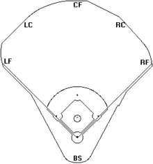 The numbers indicate the distances from home plate to the wall of that part of the field. Left field (LF) and right field (RF) normally refer to the distances along the foul lines. Left center (LC) and right center (RC) are the approximate power alley figures. Center field (CF) could mean straightaway center field or it could mean to the deepest part of the center field area. Backstop (BS) refers to the distance behind home plate to the backstop screen. These numbers[27] are one researcher's opinion of the true values and may differ from the numbers marked on the wall/fence by as much as 30 feet (9.1 m). Capacity[28] figures may also vary.