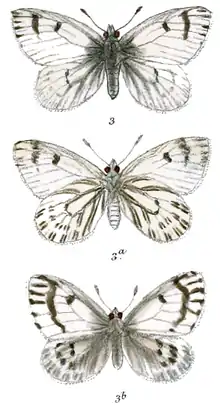 A variety potaxini Alpheraky, is recorded from the Xian-Shan, Koko-Nor, and western China. It differs from the typical form on the upperside, in the male by the restriction and narrowness of the black markings, in the female by the ground colour which is tinged with greenish yellow. On the underside there seems to be scarcely any difference.[1]