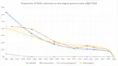 The Baltic German population never surpassed more than 10% of the total population.[5] In 1881, there were 180,000 Baltic Germans in Russia's Baltic provinces; however, by 1914, this number had declined to 162,000.[6] In 1881 there were approximately 46,700 Germans in Estonia (5.3% of the population).[7] According to the Russian Empire Census of 1897, there were 120,191 Germans in Latvia, or 6.2% of the population.[8]