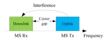 Centre gap is a key characteristic of FDD-based frequency arrangement represented by the gap between frequency blocks assigned for downlink and uplink respectively in the FDD-based arrangement as illustrated in Figure 5. It is common understanding that the duplex spacing and centre gap influence the duplexer performance so that larger separation brings the better isolation performance between downlink and uplink. Technically, this size of spacing affects the duplexer performance in the following two technical aspects: