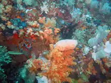 Ecologically, Bangka and its waters contain an abundance of biodiversity. Land animals include Javanese deer (Rusa timorensis), tarsier (Carlito syrichta - a nocturnal arboreal primate), common cuscus (Phalanger orientalis), Asian water monitor lizard (Varanus salvator) and wild boar (Sus scrofa). There are many coral reefs that attract tropical fish species, such as Napoleon fish, frogfish, pygmy seahorses and nudibranchs, as well as dugongs: a species of protected marine mammal. Dugongs are known to dwell and feed in waters off the island's coast.[7] Also present is a species of tubular marine sponge, the Petrosia nigricans,[8] from which four new purine derivatives have been isolated.[9]