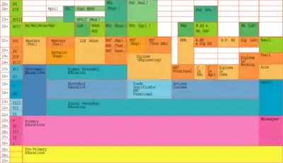 The Human Rights Measurement Initiative (HRMI)[12] finds that Bangladesh is fulfilling only 82.5% of what it should be fulfilling for the right to education based on the country's level of income.[13] HRMI breaks down the right to education by looking at the rights to both primary education and secondary education. While taking into consideration Bangladesh's income level, the nation is achieving 88.7% of what should be possible based on its resources (income) for primary education but only 76.3% for secondary education.[13] Again, the budgetary allocation is too inadequate that the following source reiterates "Out of the total budget of taka 678,064 crore (approximately 62.6 billion dollars) for FY23, the allocation for the education sector is taka 81,449 crore (approximately 7.5 billion dollars) or 12 percent of the total, compared to 11.9 percent in FY22. In terms of GDP ratio, it is 1.83 percent, lower than the outgoing fiscal year's allocation. This is one of the lowest in the world – far below the recommended minimum of 4–6% of GDP and 20% of the national budget."[14] Over the course of the past five decades, Bangladesh has achieved commendable advancements in the domain of education. As education stands as an indispensable human right, dedicated efforts are being exerted to guarantee its accessibility for every individual. Looking ahead to the next decade, it is conceivable that Bangladesh will attain a full literacy rate of 100 percent.[15]
