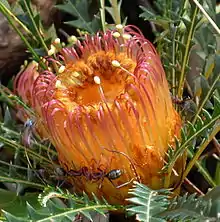Banksia dallanneyi, commonly known as couch honeypot,[2] is a species of prostrate shrub that is endemic to Western Australia. It only has a short above-ground stem, pinnatipartite or pinnatisect leaves, between thirty and seventy variously coloured flowers and glabrous, egg-shaped fruit.