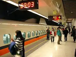 Banqiao (Chinese: 板橋)[12][13][14] is a railway and metro station in New Taipei, Taiwan served by Taiwan High Speed Rail, TRA and Taipei Metro. With the exception of the Circular Line, all other tracks and platforms in the station are located underground. The station is served by the fastest HSR express services of the 1 series.