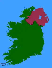 Bantry Bay (Irish: Cuan Baoi / Inbhear na mBárc / Bádh Bheanntraighe) is a bay located in County Cork, Ireland. The bay runs approximately 35 km (22 mi) from northeast to southwest into the Atlantic Ocean. It is approximately 3-to-4 km (1.8-to-2.5 miles) wide at the head and 10 km (6.2 mi) wide at the entrance.