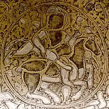 The general style of the basin is a continuation of previous works. The friezes of animals is an element that predates Islam.[38] All the frieze animals are traditional species in the arts of middle east: all are found, for example, in the copies of Ibn Bakhtishu's Manafi al-Hayawan. In particular, the unicorn chasing the elephant is a recurrent theme of Islamic art, which echoes legends reported by al-Jahiz and al-Qazwini in particular; it is found on lustrous tiles in the thirteenth century in Iran and on bas-reliefs in Konya during the same period.[39] In the same way, the association between the griffin and the sphinx is well established at the time of the creation of the Baptistery.[40] Only the serpentine dragon could have been a novelty tbat arrived in Egypt with the Mongol invasion; however, they are found in the Syrian zone from the Seljuk period. Rounds of fish including other animals become a motif according to E. Baer at the beginning of the fourteenth century, as shown by an Iranian brass inlaid metal bowl, dated around 1305.[41] For her, these motifs "evoke – it seems – dreams about distant seas and foreign whose waters bring wealth and good fortune. " Several elements would indicate a certain sense of humor on the part of the artist, such as the absurd inscription on the flat, or the presence of a small rabbit represented from the front, for short, which seems to look directly at the viewer.