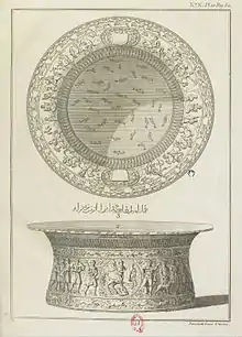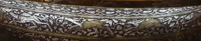 It has decoration depicting human figures both internally and externally, which is characterized by a great diversity of characters, in their clothing, their physical appearance and their postures. According to D.S. Rice, this decoration would be oriented along an axis passing through the silver under the rim of the basin and a characteristic armor.[12] All the figurative motifs are located on a background of plant foliage, where various animals are located. Outside, the decoration occupies the lower part of the basin; it consists of a main register with friezes of characters interrupted by four medallions, bordered by two friezes of running animals, interrupted by four medallions bearing a fleur-de-lys heraldry. Above the upper register, a vegetal pattern ends with lancets. A large inscription in silver takes place on the area remained untouched. A running animal frieze is also present on the edge of the rim.