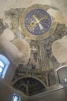 In the center of the dome roof is the Chi Rho symbol. The golden Chi Rho mosaic sits on a deep blue background and is surrounded by gold, blue, and white stars. The Chi Rho is flanked by the letters alpha and omega, in reference to Revelation 1:11. Above the Chi Rho is the hands of the Eternal Father (Dextera dei) clutching a jeweled laurel wreath wrapped in a golden ribbon.[4]
