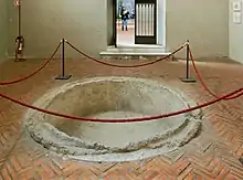 The baptistery is approximately 7 × 7 meters.[2] The interior is octagonal with a domed roof. The piscina, 2 meters across and 45 cm deep, is made of earthenware.[2] The piscina was not deep enough for the baptized to be fully submerged. Instead of full immersion, the baptized stood in the piscina and the water was poured over their head three times.[5] This is evidenced by baptism iconography located in the Roman Catacombs.[5]