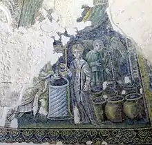 The baptistery was likely built in the fourth century. There are conflicting accounts of who commissioned the construction of the baptistery and when. Severus, the twelfth bishop of Naples, is often credited with its construction in the late fourth century.[2] The construction of the baptistery by Severus is chronicled in John the Deacon’s Gesta episcoporum Neapolitanorum.[3] However, the thirteenth–fourteenth century work Chronicle of Saint Mary of the Principle, credits Constantine the Great with the building of the baptistery at the same time as the S. Restituta during the early fourth century.[4] The architecture and mosaic style lead researchers to believe that the baptistery was more likely to have been constructed in the later fourth century. The baptistery was remodeled under the nineteenth Bishop of Naples, Soter (465–486).[2]