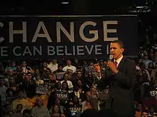 Obama won the first contest in the Democratic nomination season, the January 3, 2008 Iowa Democratic caucus. Obama had the support of 37.6 percent of Iowa's delegates, compared to 29.7 percent for John Edwards and 29.5 percent for Hillary Clinton.[70] In his remarks to his followers that evening, he said: "On this January night, at this defining moment in history, you have done what the cynics said we couldn't do."[71] He further noted that "our time for change has come" and suggested that in the future Americans will look back on the 2008 Iowa caucuses and say, "this is the moment when it all began."[72]