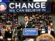 Obama's win in Iowa was seen as a boost to his already-improving chances in New Hampshire. On January 4, he told supporters in New Hampshire, "If you give me the same chance that Iowa gave me last night I truly believe that I will be the president of the United States of America."[73] The campaign received another boost when former New Jersey senator and 2000 Democratic presidential candidate Bill Bradley endorsed Obama on January 6.[74] At the Democratic debate at Saint Anselm College in Goffstown, New Hampshire, on January 5, Obama, Clinton, and Edwards all battled over who best exemplified the buzzword of the campaign, "change".[75][76] In one key exchange, Clinton said, clearly targeting Obama's rhetorical prowess, "Making change is not about what you believe; it's not about a speech you make. ... We don't need to be raising false hopes."[76] Obama replied that "The truth is, actually, words do inspire. Words do help people get involved."[77]
