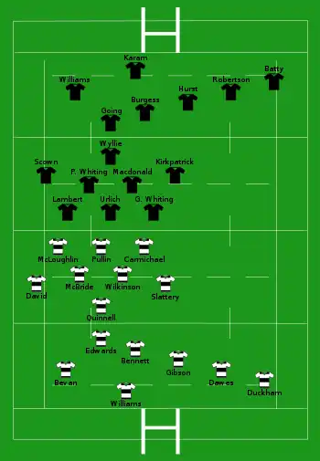 The Barbarians selected a strong team for the match; 12 of the starting line-up had been part of the British Lions' touring party to New Zealand in 1971. In keeping with Barbarians tradition, English lock Bob Wilkinson and Welsh flanker Tommy David were uncapped for their countries, while Llanelli RFC's Phil Bennett was the heir apparent to the now-retired Barry John at fly-half. David and wing John Bevan were late additions to the side; David was promoted from the replacements' bench after Swansea RFC's Mervyn Davies came down with the flu, resulting in Derek Quinnell being moved to Number 8 to accommodate David at blindside flanker, while Bevan had been called up from a scheduled game for Cardiff RFC that day to replace the injured Gerald Davies, another 1971 British Lion.[5] The strength of the Barbarians' side led to the media billing the match as the fifth test of the 1971 Lions tour.[5][6]