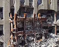 At the time of the September 11, 2001 attacks, the Barclay–Vesey Building was being renovated.[42] The Barclay–Vesey Building had been adjacent to 7 World Trade Center to the east and the World Trade Center's Twin Towers to the south,[128] and when the three buildings collapsed during the attacks, the south and east facades were severely damaged by falling steel beams.[42] The collapse of the World Trade Center caused the partial collapses of some floor slabs near the windows,[42] though the building as a whole was not in immediate danger of collapse.[129] Debris also sliced water mains, flooding the basements.[130][131] As a result, underground cable vaults belonging to Verizon, along with other underground utility infrastructure, were heavily damaged from water and debris.[132] The Barclay–Vesey Building received only moderate damage because its thick-masonry design gave the building added strength,[103] but two of the facades were damaged.[44] The masonry allowed the structure to absorb much of the energy from debris hitting the building, and damage was restricted mostly to impact points.[103][133] Although no fires were observed in the Barclay–Vesey Building,[134] the ground-floor murals were damaged by smoke.[135]