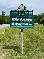 Most of Betty Hill's notes, tapes, and other items have been placed in the permanent collection at the University of New Hampshire, her alma mater.[1] In July 2011, the New Hampshire Division of Historical Resources marked the site of the alleged craft's first approach with a historical marker.[2]