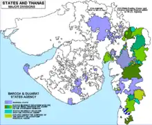 ![]() Map of the area of the Baroda and Gujarat States Agency. The territories of Baroda State are in violet and those of other states in green. | |||||||||||||