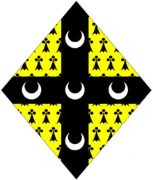 Arms of Ellis: Erminois, a cross sable charged with five crescents argent[1] borne in a lozenge shaped shield by the present Baroness Howard de Walden
