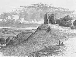 The 40-foot-high (12 m) tower castle of Giffen lay near to the existing Mains of Giffen site on the 180-foot-high (55 m) summit of a whinstone trap ridge at (NS 37727 50718). MacGibbon and Ross[6] suggest that Giffen Castle was built in the 15th century, although the 13th-century (1233)[7] land grant to Walter de Mulcaster, and the prior existence of a chapel, suggest that a defensive structure of some sort was present at that date. At the time of Pont's survey (J Dobie 1876), it was a tower 30 ft (9.1 m) square, 40 ft (12 m) high, with walls 6 ft (1.8 m) thick. It fell into disrepair soon after 1726 and finally collapsed in 1838. It has also been recorded as 'Griffen' on some old maps of the district.