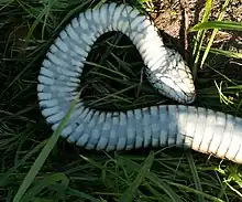 In defence they can produce a garlic-smelling fluid from the anal glands, and feign death (thanatosis) by becoming completely limp[8] when they may also secrete blood (autohaemorrhage) from the mouth and nose.[9] They may also perform an aggressive display in defence, hissing and striking without opening the mouth. They rarely bite in defence. When caught they often regurgitate the contents of their stomachs.
