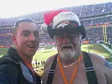 Barrel Man, real name Tim McKernan (September 5, 1940 – December 5, 2009),[1] was a superfan of the Denver Broncos. In all types of weather for 30 years, he attended every home game at both Mile High Stadium and INVESCO Field at Mile High wearing nothing but an orange barrel that covered his torso and a cowboy hat and boots. His costume was reminiscent of rodeo clowns (or barrelmen) who serve as a distraction to animals in the rodeo arena in order to protect riders who have been thrown and of the stereotype of the miner who lost his stake and had nothing left to wear but a barrel. He was the first Broncos fan inducted into the VISA Hall of Fans[2][3] at the Pro Football Hall of Fame.[4][5]