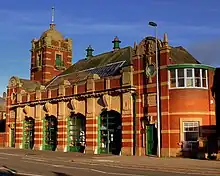The Central Fire Station on Abbey Road in Barrow-in-Furness, Cumbria, England is a Grade II listed former fire station that has been described by Historic England as a "well-preserved example of the first generation of fire station built specifically for motorised appliances".[1] Constructed in 1911 and opening a year later, the building served as the town's only station until Cumbria Fire and Rescue Service completed their first new-build station on Phoenix Road in 1996.[2] The building is noted for its striking red brick facades and buff terracotta dressings, it bears a strong resemblance to the Technical School built less than 10 years prior nearby on the opposite side of Abbey Road. The building has since been converted into a 'Bed Brigade' store.