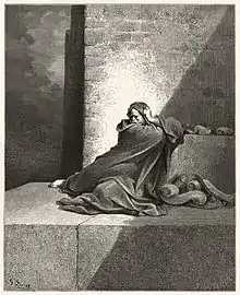 The rabbis described Baruch as a faithful helper and blood-relative of Jeremiah. According to rabbinic literature, both Baruch and Jeremiah, being kohanim and descendants of the proselyte Rahab, served as a humiliating example to their contemporaries, inasmuch as they belong to the few who harkened to the word of God.[13] A Midrash in the Sifre regarded Baruch as identical with the Ethiopian Ebed-melech, who rescued Jeremiah from the dungeon,[14] and states that he received his appellation Baruch ("blessed") because of his piety, which contrasted with the loose life of the court, as the skin of an Ethiopian contrasts with that of a white person.[15] According to a Syriac account, because his piety might have prevented the destruction of the Temple, God commanded him to leave Jerusalem before the catastrophe, so as to remove his protective presence.[16] According to the account, Baruch then saw, from Abraham's oak at Hebron, the Temple set on fire by angels, who previously had hidden the sacred vessels.[17]