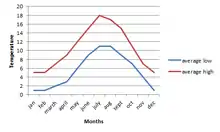 The graph on the right shows yearly average high and low temperatures in Barugh. Compared to the rest of the United Kingdom, the average temperatures are lower in Barugh.[16] This could be because Barugh is in the North of the UK where Temperatures are colder. Barugh is just south of the North York Moors National Park.