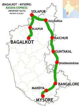 The Basava Express is an Express train belonging to South Western Railway zone that runs between Mysore Junction and Bagalkot in India. It is currently being operated with 17307/17308 train numbers on a daily basis.[1][2][3]
