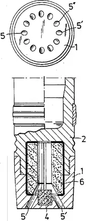 Diagram of a base bleed unit. The top diagram shows the bottom of the shell and the location of the gas vents. The bottom diagram is a cut-away view showing the gas generator mechanism.