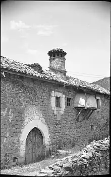 A baserri (Basque pronunciation: [bas̺eri]; Spanish: caserío vasco; French: maison basque) is a traditional half-timbered or stone-built type of housebarn farmhouse found in the Basque Country in northern Spain and Southwestern France. The baserris, with their gently sloping roofs and entrance portals, are highly characteristic of the region and form a vital part in traditional Basque societal structures.[1] They are also seen to have played an important role in protecting the Basque language[2] in periods of persecution by providing the language with a very dispersed but substantial speaker base.