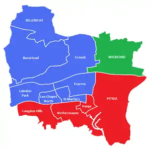 There are nine civil parishes in the borough. The town of Basildon itself is an unparished area, as is a small area west of Wickford.[20] The parish councils for Billericay and Wickford are styled "town councils", whilst that for Great Burstead and South Green is styled a "village council". The civil parishes are:[21]