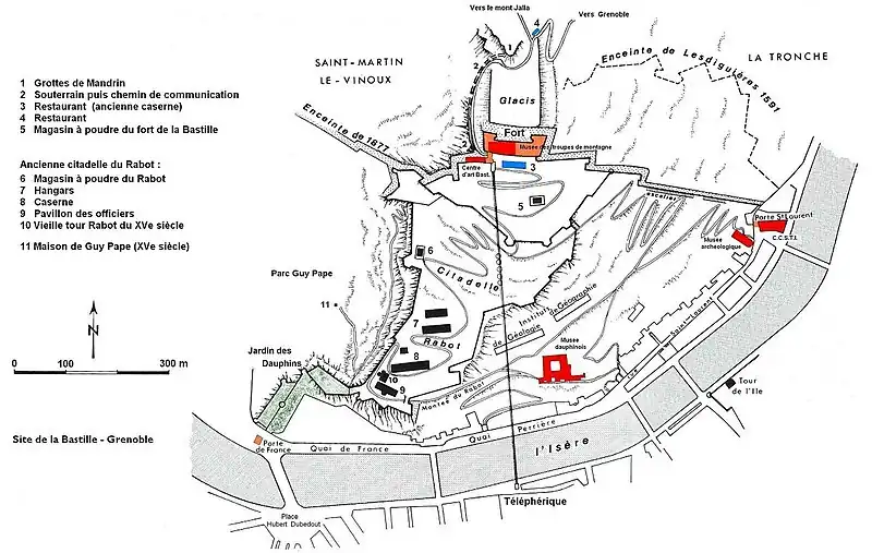 - ↑ According to Maurice Mercier in Histoire des fortifications de Grenoble, p.65, the remains of this first fortress must lie underneath the existing glacis.