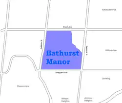 Bathurst Manor is a neighbourhood of Toronto, Ontario, Canada, located in northern Toronto in the former suburb of North York. It sits on a plateau bounded on the north by Finch Avenue West, on the west by Dufferin Street, on the east by the Don River (west branch), and on the south by Sheppard Avenue West. The area is also regarded as part of the Downsview postal area as designated by Canada Post. It is part of the former city of North York, which merged with five other municipalities and a regional government to form the new "City of Toronto" in 1998. It is part of the federal and provincial electoral district York Centre, and Toronto electoral ward 10: York Centre (East). In 2006, it had a population of 14,615.[1]