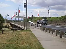 The Macquarie River divides Bathurst with the CBD located on the western side of the river. Four road bridges and two rail bridges span the river within the city area. From the upstream side they are: Macquarie River Railway Bridge (built in 1876[7]) closed in 2011 (replaced with a new concrete single track rail bridge structure alongside and brought into use in 2011); the four lane Evans Bridge which opened in 1995; the Denison Bridge opened in 1870 (closed to road traffic and now a pedestrian bridge); the Gordon Edgell Bridge, a low−level bridge located on George Street; and Rankens Bridge at Eglinton.