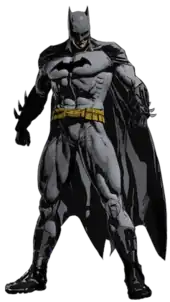 The Batsuit (or Bat-Suit) is the costume of DC Comics's fictional superhero Batman, who appears in their American comic books. The suit has been depicted in various artistic iterations, and the stories themselves have described Batman as modifying the details of his costume from time to time. However, it usually consists of a gray or black body suit, the chest emblazoned with a stylized black bat either with or without a yellow ellipse around it, and blue-black accessories: a wide scalloped cape, gloves with a series of fin-like projections, black or blue trunks, boots, and a close-fitting cowl (covering the upper half of his face) with ear-like projections to suggest a bat's head; and a yellow or gold utility belt containing a variety of gadgets.
