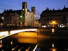 - Pont Battant: Originally this was an ancient Roman stone bridge with five arches and a width of about 4 metres. For long times it was the only bridge over the river Doubs.[1] During the Middle Ages and renaissance the bridge was repaired and modified several times.[1] At the beginning of the 20th century, the Pont Battant consisted of the main three arches, the river Doubs flew through, a small arch at the old town river bank and an even sized arch at Battant quarter end that was actually a 90 degree tunnel, beginning under the riverside Promenade heading through the arch (that days under a street crossing; see postcard dating 1906) and ending under the Promenade on the other side. Unfortunately the bridge was partially destroyed during World War II and restored as a provisional solution.[1] The replacement bridge, built in 1953 in concrete, had only a single arch, the design being intended to reduce the risk of flooding, like the January 1910 Doubs river flood. The bridge was often the site of an informal market where one may buy things from Sub-Saharan Africa due to its deck of 60 x 17 metres. After 60 years the concrete bridge had to be replaced. At 10. March 2012 Besançon city organized an event that ends up with the symbolic burning down the Pont Battant.[2] The bridge was shut in April. Disassembling began in May.[1] A pedestrian bridge was built on an interim basis. This temporary bridge was deconstructed, when 20. June 2013 the new bridge partially opened for those walking footpaths and for bicyclists only.[3] The new Pont Battant was tested to take the weight of 400 tons, although it will have to withstand a calculated max weight of 160 tons. It passed the test at 28. October 2013.[4][5] The first tram, named after the French writer "Victor Hugo", crossed the new Pont Battant 15 January 2014.[6] The new bridge has a single arch made of 1,100 tons of steel filled with 800 tons of concrete. It spreads 60 metres (the bridge segment is 65 metres), at a width of 24 metres and costs 7 million Euros. On the surface a mixture of resin and sand was spray coated.[7] The immense width is needed to provide enough space for the 90 degrees curved rails for trams and a wide sidewalk. Until now (March 2014) several love locks were installed at the steel wire net of the railings. The first love locks were seen a few months before the reconstruction ended 30. November 2013.[8]