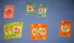 In some editions from the 1960s, strikes and outs are color-coded orange, balls green, and all cards that advance a runner, blue, while in late-1950s editions, strikes and outs are green, balls blue, and cards advancing a runner, red. The cards are illustrated with line drawings of the action represented by the card; in the 1960s, a New York Mets edition included Mr. Met as the principal figure in the illustrations, and a Mets logo as the back design.