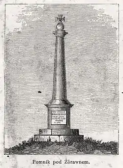 In 1876, on the 200th anniversary of the battle, the Polish population of Zurawno founded a commemorative monument to celebrate the halt of the Ottoman advance into Eastern Europe.