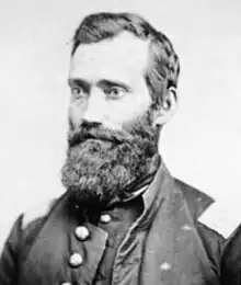 Realizing the vulnerability of the settlers of central Minnesota, the U.S. Volunteer Army preemptively dispatched mustering units from Fort Snelling to reinforce and protect the frontier. Among these was Captain Richard Strout's detachment of the Tenth Minnesota Infantry Regiment. On this journey, Strout's company comprised of 64 men, most of whom originally enlisted for the Civil War or were civilian volunteers seeking to protect their communities.[2] Strout's command marched on orders to patrol the areas around Hutchinson, Acton and Forest City, dated August 24.[3] On September 2 they camped 2½ miles northwest of the home of Robinson Jones,[4] where the murder of Jones and several others by four young Dakota men on August 17, in what was later termed the Acton Incident, had shed the first blood of the conflict.[3]