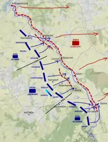 The battle of Aldenhoven, showing the approximate positions of the Coalition defence line and the main thrusts of the French assault. The Roer river is marked in blue.