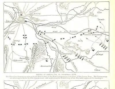 Entrenchments existed just outside Amiens, but Farre deemed them too weak and too close to the city.[2] He chose to make his stand east, southeast, and south of Amiens along a line about 25 kilometres (16 mi) in length. It ran south from the left bank of the Somme at Corbie and Villers-Bretonneux — about 12 miles (19 km) east of Amiens — and the Hangard Wood, a good defense position facing southeast in which Farre deployed a strong force. The French line then ran southwest to Boves (southeast of Amiens), and from there west to Hébécourt (south of Amiens) and then to Pont-de-Metz (southwest of Amiens).[5] Along this line, the Army of the North constructed strong earthworks and artillery emplacements.[2] On the evening of 26 November 1870, Farre completed the concentration of his troops along the line. On the French left wing, Colonel Joseph Arthur Dufaure du Bessol's 3rd Brigade held the bulk of its forces at Villers-Bretonneux (commanding the road southeast to Tergnier), with detachments at Gentelles and Cachy. In the center, Colonel Joseph Derroja's 2nd Brigade held a line extending from the Montdidier road to Saint-Fuscien, passing through and centered on Boves (which commanded the road south to Paris). Farre originally intended to deploy General Alphonse Lecointe’s 1st Brigade to defend the entrenchments on the French right south of Amiens, but instead deployed Lecointe’s brigade in a position to support Bessol's 3rd Brigade around Villers-Bretonneux. The French right, centered on Dury — which lay west of Boves, south of Amiens, and north of Hébécourt and commanded the road south to Breteuil[6] — therefore was defended by a mixed force consisting of three battalions of Garde Mobiles deployed from Pont-de-Metz eastward to the main road from Amiens through Dury and Hébécourt; a battalion of the 43rd Regiment, the 19th Chasseur Battalion, and two Fusiliers Marins companies in the vicinity of the road; and four Garde Mobile battalions to the east of the road. Behind the troops on the French right, the National Guard from Amiens formed a reserve. A 12-gun artillery battery, which had barely disembarked after arriving from Arras, occupied a shoulder which cut the road north of Dury, soon reinforced by a battery of four guns from the National Guard.