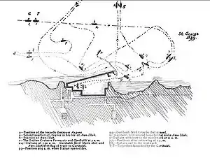 At a distance of 6,000 metres (6,600 yards), the Italians opened fire upon the Ottoman corvette. The Ottomans returned fire ineffectively until 09:35 when the Italian gunfire set Avnillah afire. Receiving heavy damage and outgunned, the corvette struck her colours and the crew abandoned ship. At this point Garibaldi sailed in close and engaged Angora at 600 metres (660 yards) with gunfire but failed to damage it.[1] Garibaldi then attempted to finish off Avnillah by firing a torpedo at her. However, the torpedo deviated from its trajectory and hit several lighters moored nearby, sinking six of them.[8] Undeterred, the Italian cruiser fired a second torpedo that struck the Ottoman corvette amidships. By 11:00 the corvette was sunk in shallow water and the pair of cruisers withdrew to the north.[9] The action was not over however; at 13:45, the Italian cruisers returned and once more engaged the Ottoman forces. The only warship left in the harbour was the torpedo boat Angora so Ferruccio moved in close and engaged it with gunfire for three minutes before it joined Avni-Illah at the bottom of Beirut's harbour. Once the fighting had ended the two Italian cruisers sailed off in a westward direction.[10]