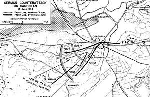 At this critical point, sixty tanks from Combat Command A of the 2nd Armored Division and accompanied by infantry of the 29th Division,[3] counterattacked southwest from Carentan at 4:30 p.m.,[3] inflicting severe casualties on the Germans and forcing them to withdraw with the loss of four tanks.[4] The American victory led to the linkup of forces from Utah and Omaha Beaches, creating a secure lodgement area for further American operations.