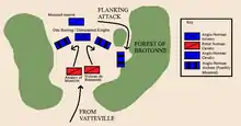 Rebellions and wars had been occurring in the Duchy of Normandy for over two decades before the events of the battle. Robert Curthose, Henry's older brother and Duke of Normandy, attacked Henry to take the throne of England for himself; this prompted Henry to invade Normandy, ending in the Battle of Tinchebray and allowed Henry to usurp the title for himself. Constant border conflicts with France and a claim to the Duchy by William Clito, Robert's son, prompted Louis VI of France to invade Normandy, and ended in the Battle of Brémule which was an English victory. Norman rebels who continued to support William's claim to the Duchy continued to cause disorder in the region.[2] One of these rebels, Waleran de Beaumont, Count of Meulan, led a force of approximately 40 local knights,[1] including Amaury de Montfort, to raid the area south-west of Rouen near Vatteville. In response to the raids, Odo Borleng, castellan of Bernay, gathered knights of Henry's household known as the Familia Regis,[4] and raised a force from the local garrisons. In total, the English army numbered around 300 men.[2] The king himself, however, did not attend the campaign and resided in Caen at the time.[1][5] Other notable members of Odo's party were William of Tancarville, the king's chamberlain, and Ralph of Bayeux, the castellan of Evreux.[2] Waleran's force was making its way from the rebellion's main headquarters at the castle of Beaumont-le-Roger to raid when their path was blocked by Odo's army on March 26.[2] The forces met in the Brotonne forest north-west of Bourgtheroulde although little is known about the exact details of the terrain where the battle took place.[2]