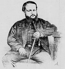 The Brazilian closed in to arrest him. Two soldiers, one on each side, tried to hold him, but López tried to wound one of them with his ceremonial sword, being retaliated with an axe blow to his head, but he was cushioned by the Panama hat he was wearing.[56] One of the imperial calvarymen got off his horse and pierced López with the spear he was holding, from bottom to top, reaching the right groin and reaching the entrails,[57] fatally compromising the peritoneum, intestine, and bladder.[58][59] This cavalryman was José Francisco Lacerda, known as Chico Diabo (Devil Frank), who was 22 year old and belonged to the regiment of colonel João Nunes da Silva Tavares, of the 19th Provisional Cavalry Corps.[60]