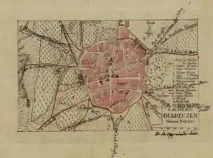 The historian Róbert Hermann and Attila Horváth point out that Nagysándor deployed his troops, not in a very lucky fashion. If Nagysándor wanted to retreat safely towards Derecske, after forcing the Russians, with the shootings of his artillery, to deploy their troops for battle and, in this way delay their pursuit, he would have deployed his corps on the southwestern part of the city.[20] Instead of this Nagysándor deployed his troops in a line in front of the city. He deployed on the left flank the infantry division of 4500 soldiers led by Colonel János Máriássy and 16 cannons.[6][21] Máriássy managed to hide his division behind the hills and mounds which lay in front of them.[21] The center stretching from the Köntös dam to Kokasló was occupied by the 1500-strong infantry division and 6 cannons of Lieutenant colonel János Bobich. The brick pits from Kokasló were defended by the 6. Honvéd battalion and the Defense Battalion of Hont County with 3 cannons, while the Köntös garden was held by 3 battalions and 3 cannons.[21] On the right flank the Korponay division was placed from Kokasló to the Nyulas taproom with around 2500 weak infantry, which partially lacked firearms, supported by the newly formed 96. Honvéd battalion, 12 cannons and 1 ½ hussar company.[21] In the large forested area from the north of the town, called Nagyerdő (Great Forest) was sent only 2 companies of the 89. Honvéd battalion and a platoon of the 14. Lehel hussar regiment ordered to make big noise, in order to "confuse the enemy".[21] The vanguard was made by 4 companies of the 1. Imperial hussar regiment.[21] Nagysándor placed 4 companies of the 8. Hussar Regiment, on the left, another four on the right wing, while the remaining 4 companies he kept as reserve, together with a battalion of militia armed with lances, probably from the Korponay division.[11][21] In front of his lines the cornfield blocked his view, while on the right flank he left the Debrecen woods (called Nagyerdő) almost completely unoccupied, which enabled the Russians to deploy their troops and encircle the right wing undetected.[6]
