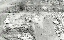 At around 11:55 am, the last remaining soldiers of the ARVN 1st Battalion were disembarked near the original landing zone in Thuận Lợi, and they too were put out of action within three minutes of touching down on the field.[22] During the afternoon, the VC had managed to destroy parts of the district headquarters building using their 57mm recoilless rifle. Second Lieutenant Williams then ordered 14 Americans inside the building, along with an equal number of Vietnamese women and children, to retreat to the artillery position located east of the town where they continued their resistance.[23] Late in the afternoon on June 10, the U.S. 118th Aviation Company was joined by other elements of the 145th Combat Aviation Battalion in their final sorties for the day; airlifting the ARVN 52nd Ranger Battalion from Phước Vinh into Đồng Xoài, with the objective of recapturing the road junction and the Special Forces Camp. Following their last mission, the 118th Aviation Company immediately returned to Biên Hòa. During the first day of heavy fighting, every helicopter in the unit had sustained damage, including the loss of one helicopter and its entire crew.[19]
