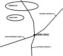 After those operations in Phước Long district and Phước Bình sub-sector, the VC 9th Division was ordered to attack Đồng Xoài.[13] In 1965, Đồng Xoài was a district town situated at a road junction which connected Inter-Provisional Road 13, National Highway 1 and Highway 14.[11] The district was defended by 200 local Vietnamese soldiers drawn from the 327th and 328th Militia Companies, and the 111th Regional Force Company. They were supported by one armoured squadron (6 armoured vehicles) and two 105mm howitzers.[15] There were also 200 Cambodian soldiers of a Civilian Irregular Defense Group, 11 United States Army Special Forces personnel and nine men of Seabee Team 1104. Prior to the battle, the U.S Special Forces had assumed control of Đồng Xoài's defences; they stepped up guard and patrol activities, and ordered the construction of new defensive fortifications around the district headquarters, the Special Forces Camp and the armoured and artillery positions on the eastern side of the district.[16][17]