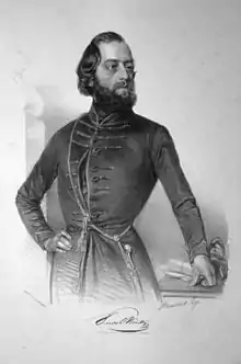 They reached Polsterau at 6 o'clock in the morning.[8] Perczel sent forward the 1-2 companies of Zrínyi's troop, led by Captains János Bangya and Ágoston Kovács, and the Miklós Hussars against the enemy outposts camped in the mill behind the town.[6] They stormed and partly killed, partly captured and chased back an outpost consisting of 20 dragoons and a platoon of the 9th Kaiserjäger Battalion.[6] The Johann Dragoons lost 2 dead, 2 wounded, several prisoners and 3 missing, while the kaiserjägers lost 12 prisoners.[6] Historian and revolutionary Pál Vasváry and Sergeant András Umheiser distinguished themselves in the fight.[6]