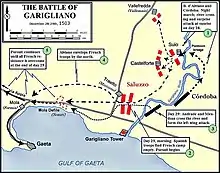 The Spanish victory was decisive, as the offensive capacity of the French army was destroyed.[3][4] After some days of siege in Gaeta, the French surrendered.[5] What remained of the French army traveled either by sea or on foot back to Milan.[5] Many died at the hands of civilians or from hunger, even the commander Ludovico, Marquis of Saluzzo, died upon reaching Genoa.[5][6] With the Treaty of Blois in 1504, France recognized Spain's authority over Naples.[1]